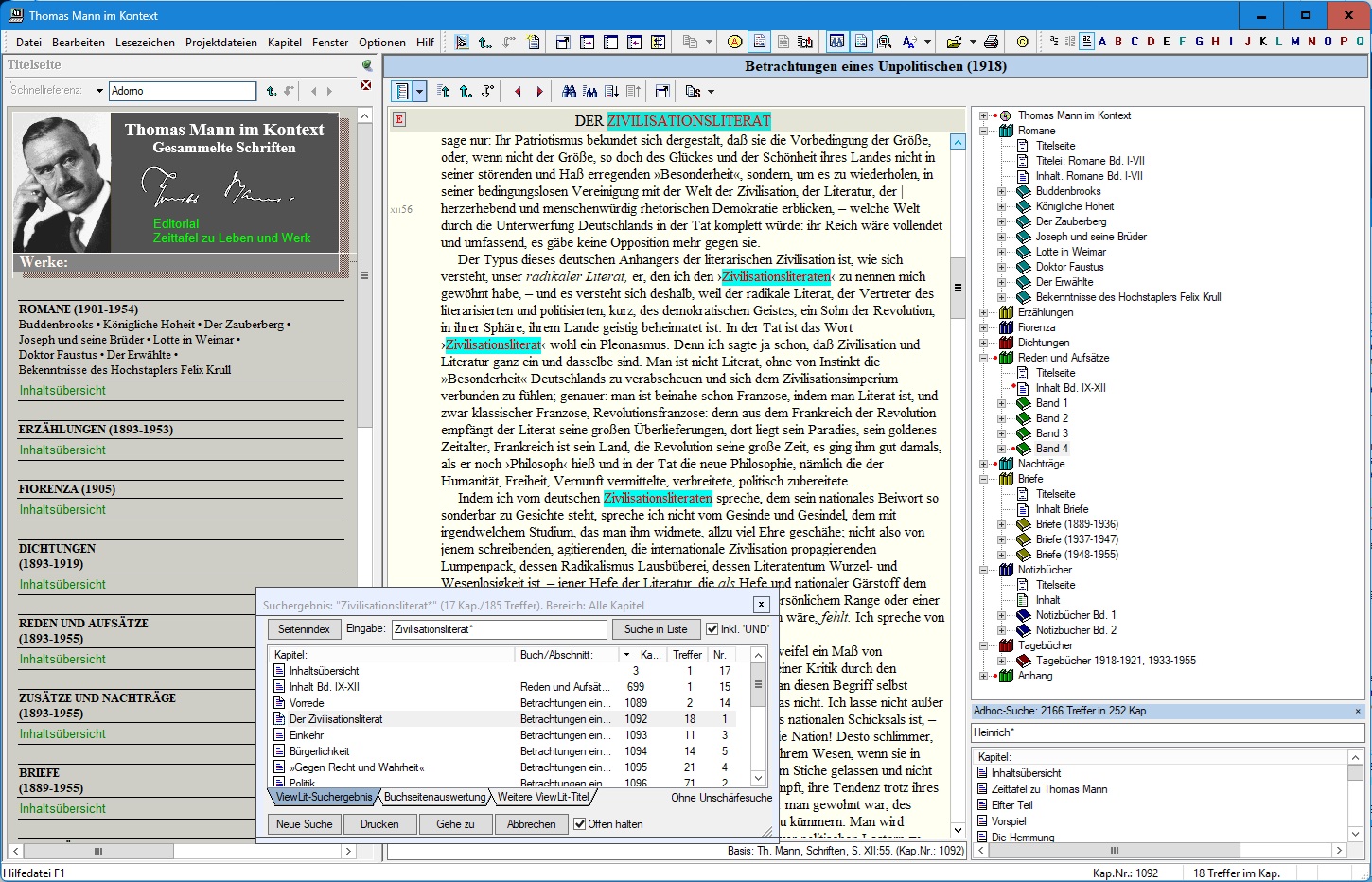 Insgesamt beinhaltet Thomas Mann im Kontext mehr als 20.000 Buchseiten der als Grundlage dienenden Referenzausgaben und bietet darüber hinaus die Recherche unterstützende Schriften- und Personenregister.